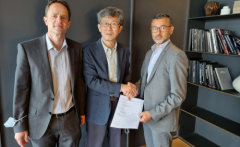 MICROBOG项目:签署LNG燃料船舶微型闪蒸气(BOG)压缩机制造和销售许可合同 从左至右:Roger Dambach——LNG TT业务部门总监,Junhan Lee——LNG Cluster总裁,Samue